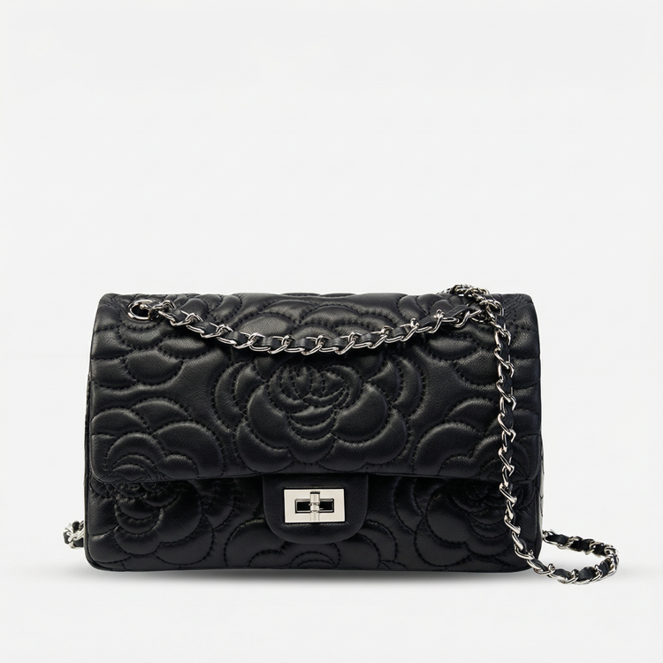 The Chiara Quilted Bag features a luxurious quilted texture and a refined structured shape, offering a sophisticated balance of style and function. Designed with spacious inside pockets, it keeps essentials neatly organized while maintaining a sleek, polished profile. A silver chain strap adds a contemporary edge, making Chiara a standout piece for both day and evening wear.